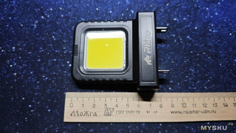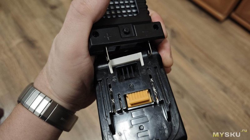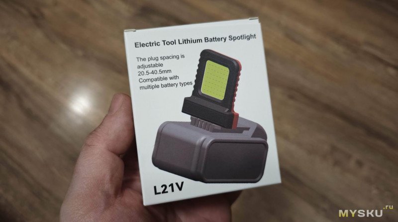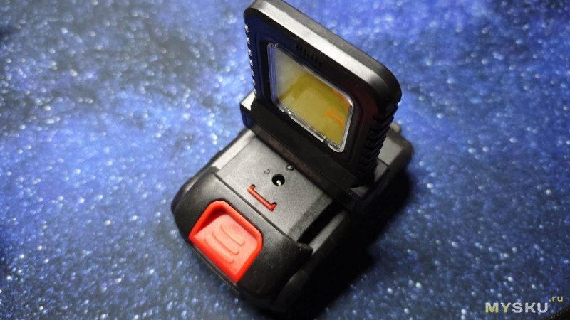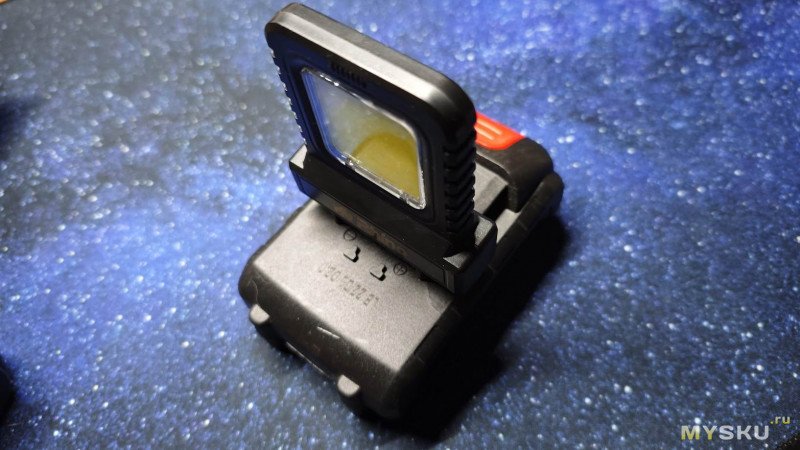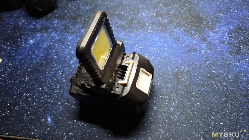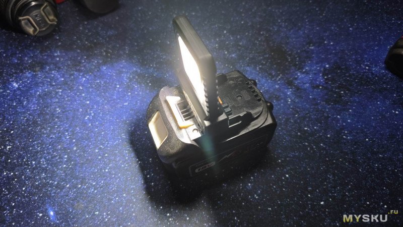 Благодаря раздвижным контактам и возможности работать со стандартным для электроинструмента уровнем напряжения 18 — 21 В, этот фонарь подойдёт под большинство популярных форматов аккумуляторов типа Makita LXT, Dewalt, Prostormer и других брендов.