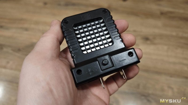 Внизу расположена единственная кнопка включения/выключения и переключения режимов свечения. По бокам от неё указаны полюса для подключения к клеммам аккумулятора.