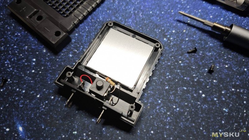 Половинки корпуса друг с другом скрепляют 4 шурупа, расположенные по его углам. Внутри вот такая бесхитростная конструкция.