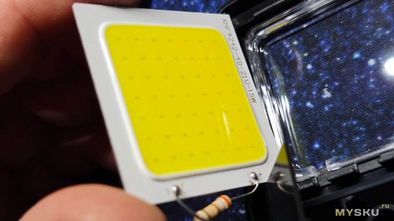 По маркировке на подложке светодиода понятно, что его номинальные характеристики: мощность 15 Вт, напряжение 21 В.