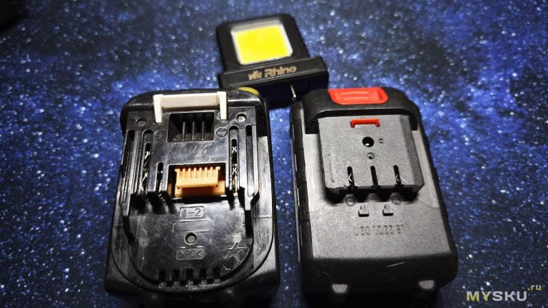 Для проверки фонарика я взял два аккумулятора от электроинструмента с напряжением 21 В (точнее с номинальным 18 В). Один типа Makita LXT от TPCELL, второй даже не знаю какого типа от садового триммера.