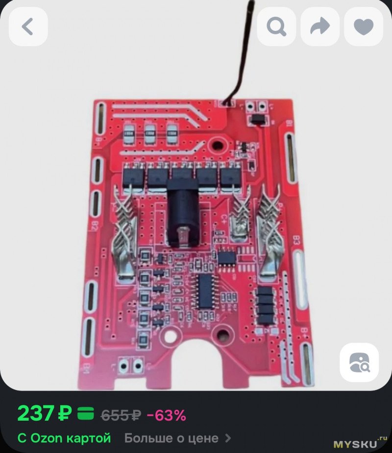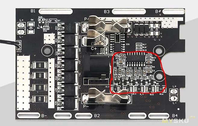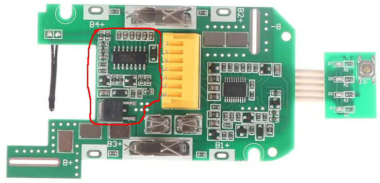 А теперь посмотрим на пару примеров плат аккумуляторов под Макиту. И обратим внимание на обведённые красным участки платы. Мы можем ясно видеть монитор питания типа только что упомянутого TI. Ключи, количество которых как минимум равно количеству групп ячеек, а также те самые шунтирующие резисторы.