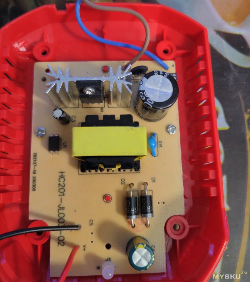 Зарядное устройство открывается с лицевой стороны шестью саморезами. Внутри открывается плата, занимающая не больше половины объёма корпуса. В зарядном устройстве имеется подключенный коммуникационный разъём, и используются 4 контакта (один из них локальная масса).