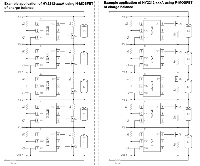 При этом, также хорошо заметно, что конструкция платы легко масштабируется до любого количества модулей аккумулятора. Принцип работы следующий. Как только напряжение на какой-то ячейке превышает максимально допустимое, параллельно этой ячейке подключается шунтирующий резистор. Его назначение — снизить зарядный ток, проходящий через эту ячейку и, тем самым, замедлить рост напряжения. Другие ячейки, тем временем, будучи на полном зарядном токе, должны набирать заряд быстрее. Если же зарядный ток снят, то балансир, работающий по этому принципу, просто отключается. Но и не может выполнить балансировку ячеек, если напряжение на них, всё таки, различается. Соответственно, он не оказывает никакого влияния на аккумулятор, который находится на хранении, что и является вторым после цены его достоинством. На плате балансира, приведённой на фото, установлена микросхема B83A (в корпусе SOT-23-6) для Li-Ion, которая отслеживает максимальное напряжение на своей ячейке. В зависимости от типа аккумулятора, применяются микросхемы с разным напряжением срабатывания. Типичная схема включения представлена на следующем рисунке.