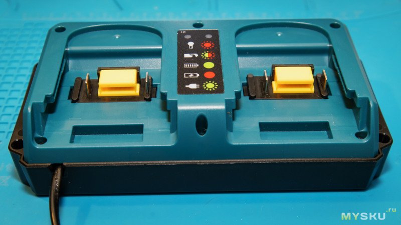 Зарядное устройство имеет компактный корпус. В отличие от «фирменных» устройств Makita, это устройство не имеет защитной крышки, прикрывающей ножевые разъёмы и коммуникационный разъём.