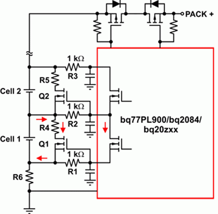 Чуть более сложный вариант управления вместо полностью индивидуальных цепей контроля напряжения и разряда предполагает использование общего монитора. При сохранении отдельных цепей разряда для каждой ячейки. Вот например фрагмент схемы включения монитора Texas Instruments BQ77PL900, который используется для балансирования аккумуляторов Li-Ion из 5-10 групп ячеек.