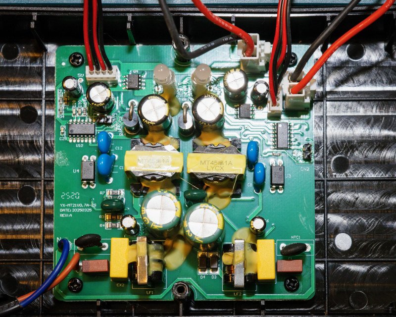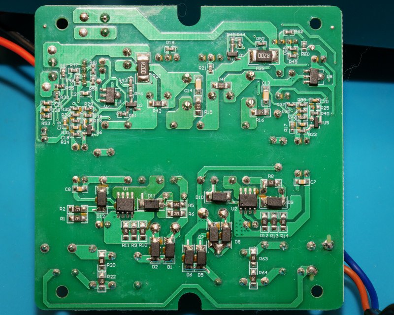 С позиции схемотехники, плата зарядного устройства представляет собой два абсолютно независимых канала. Общим для них является лишь подключение сетевого кабеля. Остальная часть, даже входные фильтры, которые установлены перед трансформаторами первичного питания, являются полностью независимыми. То есть можно предположить, что что бы ни случилось с одним каналом, второй канал продолжит работать. Как ни странно, разводка платы неодинакова для каждого канала. Часть элементов расположена симметрично, но далеко не все. Более того, например диоды входного моста правого канала D3-D4 оказались с верхней стороны платы. Остальные два — снизу. У первого канала все 4 диода снизу. Разъёмы коммуникационной шины расположены по краям платы вблизи своих микроконтроллеров, а вот силовые разъёмы расположены рядом справа на плате. Чем руководствовались разработчики платы — не ясно.