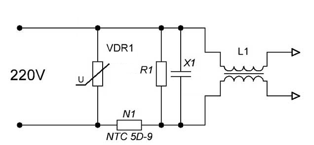Тем не менее на плате присутствуют входные фильтры, хотя входной предохранитель отсутствует. Фильтры обоих каналов расположены в нижней части платы. Примерная схема фильтров выглядит следующим образом.