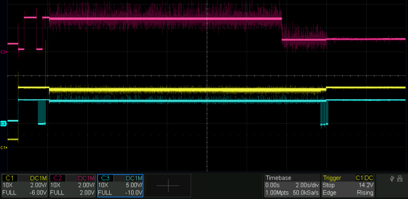 Проверка цифрового интерфейса. Задействованы 3 контакта. Осциллограммы сняты в режиме, когда аккумулятор уже установлен, а зарядное устройство включается в сеть 220В. Суммарно, процесс включения длится больше 16 секунд. На шине данных хорошо заметны пачки сигналов в начале подачи питания и примерно через 14 секунд.