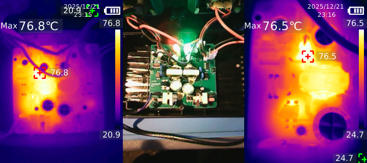 Во время заряда, очень сильно греются трансформаторы и диоды D13-D14. Согласно тепловизору, их температура достигает 77 градусов. Причём это при открытом корпусе. На фото хорошо заметно, то и трансформаторы, и диоды D13-D14 каждого канала расположены рядом, как и конденсаторы для сглаживания выходного напряжения. Очевидно, такой температурный режим нежелателен. И становится понятным, зачем были установлены именно конденсаторы до 105 градусов. Хотя, совершенно не ясно, зачем столь сильно нагревающиеся элементы было располагать на плате компактно в центре, хотя места вокруг более чем достаточно.