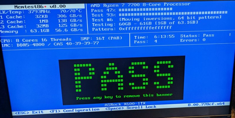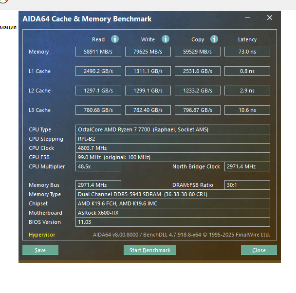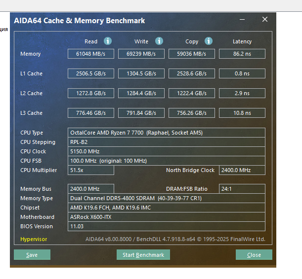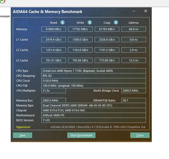 Тестов сделал два — бенчмарка памяти в AIDA64 и встроенный бенчмарк киберпанка, чтобы просто сравнить, что потерял при переходе на более медленную память. Процессор — Ryzen 7 7700, материнка — asrock deskmeet x600 без чипсета.