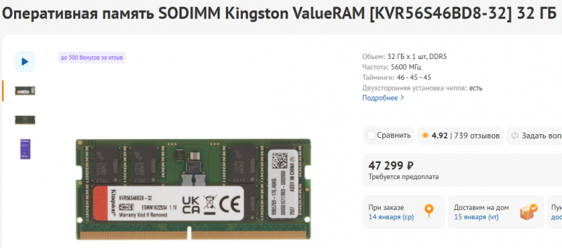 Один DDR5 SODIMM на 32 гигабайта на барахолке стоит, как выше написал, 15 тысяч в среднем. То есть 64 гигабайта обойдутся в 30 тысяч. Плюс 1200 на пару переходников — итого за 32 тысячи (округлим) вы имеете 64 гигабайта. Экономия в 20 тысяч относительно DIMM'ов на барахолке и почти в 50 тысяч относительно магазина.