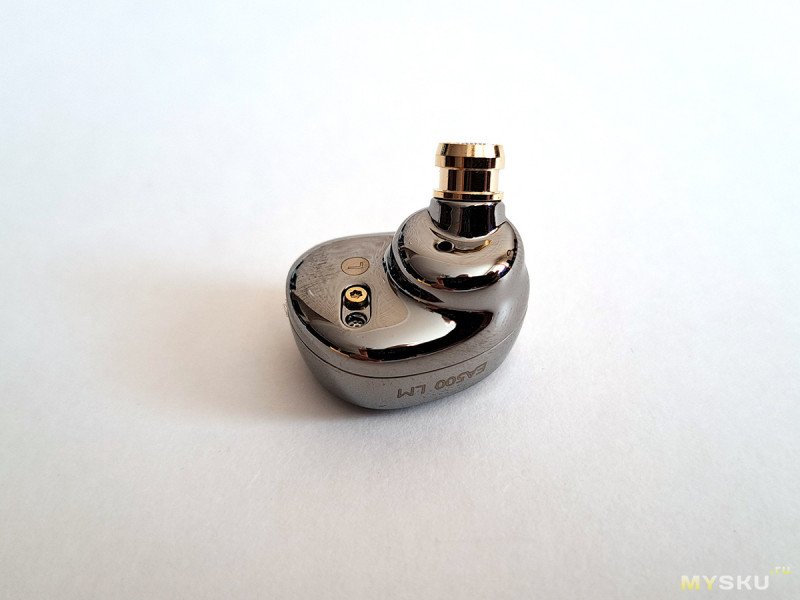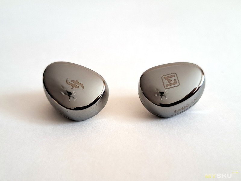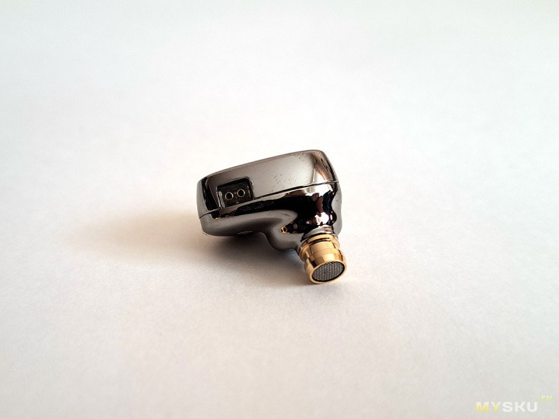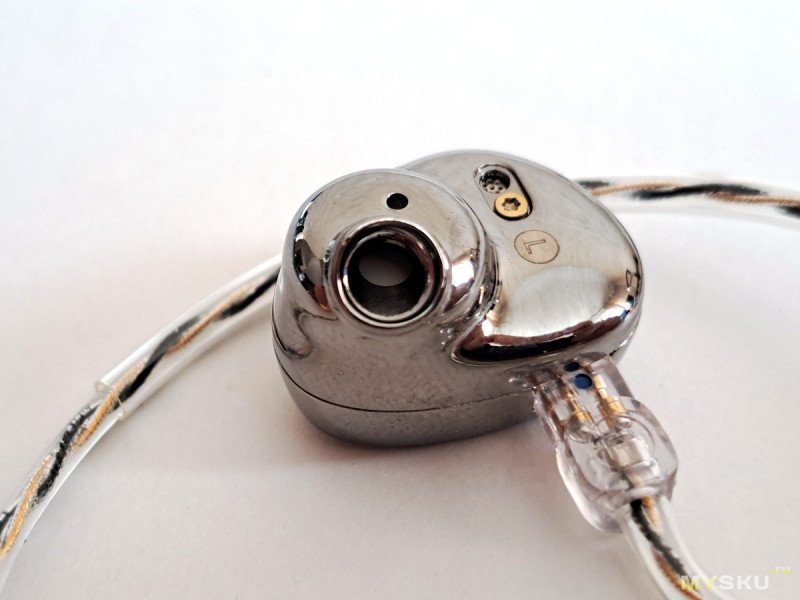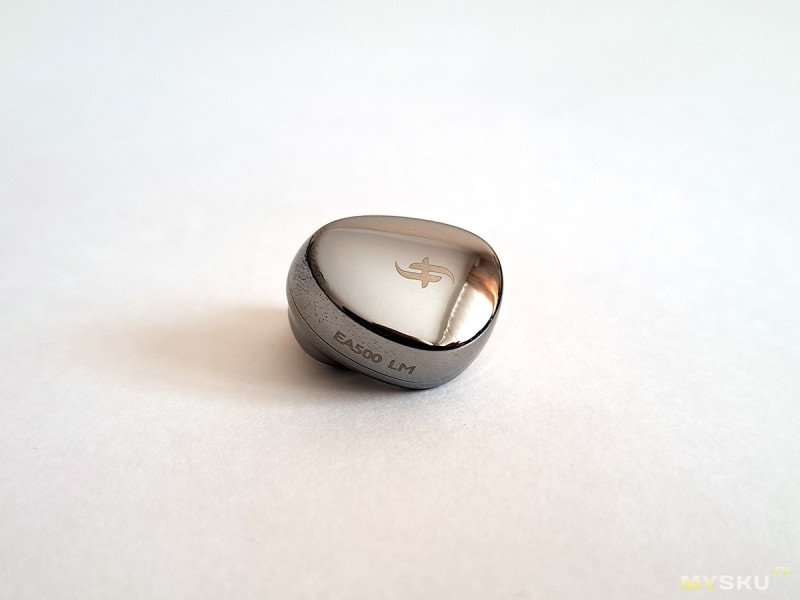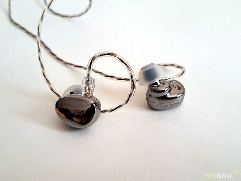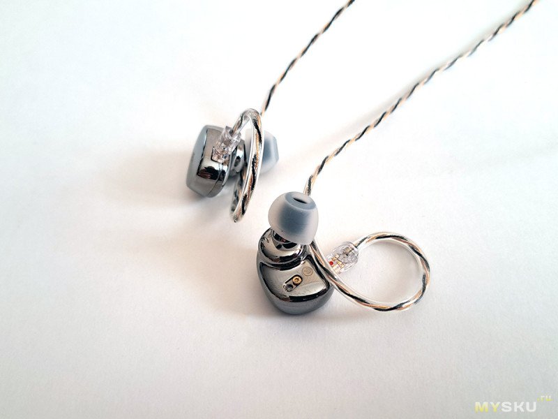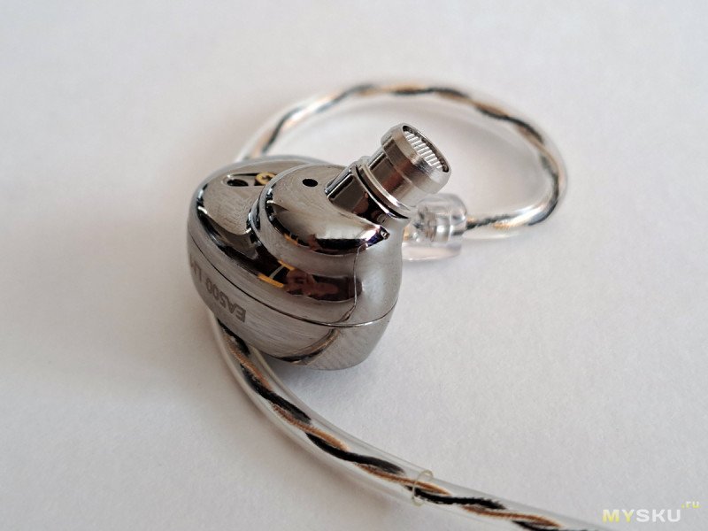 Корпуса у наушников стальные, с хромированным покрытием. Выглядят нарядно и технологично, но очень маркие. Мгновенно собирают на себя отпечатки пальцев, а в будущем могут поцарапаться. Кстати, существует модель наушников Simgot EA500 DSP с встроенным в кабель ЦАПом и штекером USB. У них такой же корпус, но покрытый матовой черной краской. Не так красиво, но зато намного практичней.