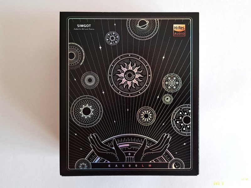Коммерческая коробка у наушников, на мой вкус, очень красивая. Картон черного цвета и большинство рисунков нанесены серебристой краской с голографическим разноцветным отливом.