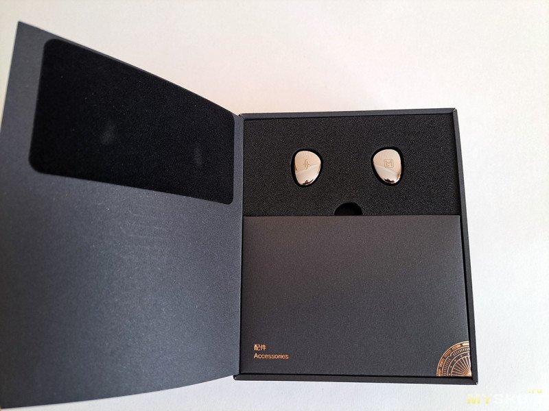 Если извлечь вставку из вспененного материала, в которой хранятся корпуса наушников, видны две коробки. Судя по надписям, в одной амбушюры, а в другой аксессуары.
