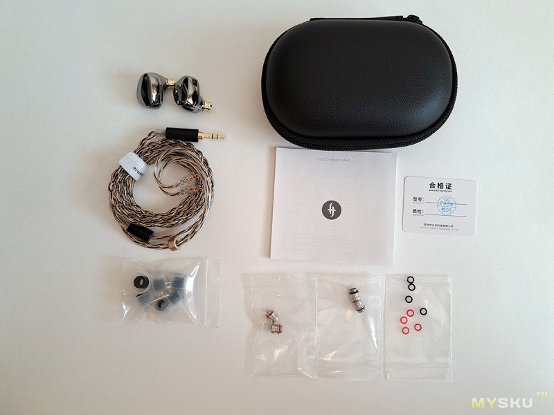 Комплектация довольно богатая: руководство пользователя и талончик ОТК, кабель, чехол, комплект амбушюр, две пары сменных звуководов и набор уплотнительных колец для них.