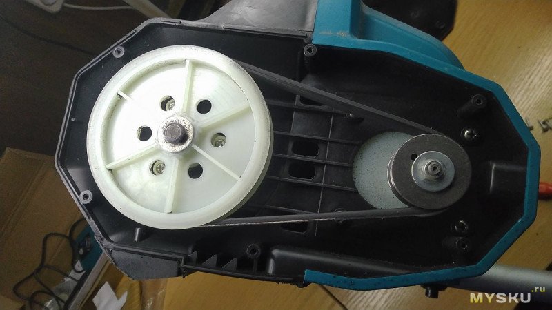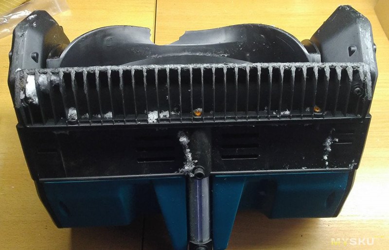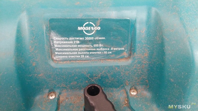 Сам аппарат собран на обычном коллекторном движке, правда каком-то довольно крупном, заметно крупнее чем в шуруповертах. Разбирать не буду, я и прошлый раз только чуть раздвинул половинки чтобы убедиться что никакого брушлесс там нету, хотя продавец утверждал обратное. Акумы задвигаются отвратительно туго. Есть поворотные флажки для регулировки направления выброса снега. «Курок» с фиксацией и защитой от случайного нажатия — респект.