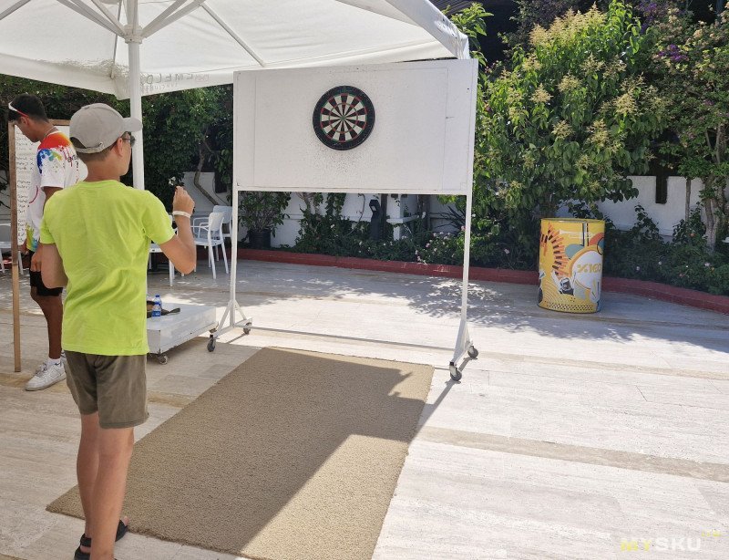 На морях сыну заходит играть в дартс, получается. Купили и дома играть, но магнитный, чтобы не убивать стены иголками.