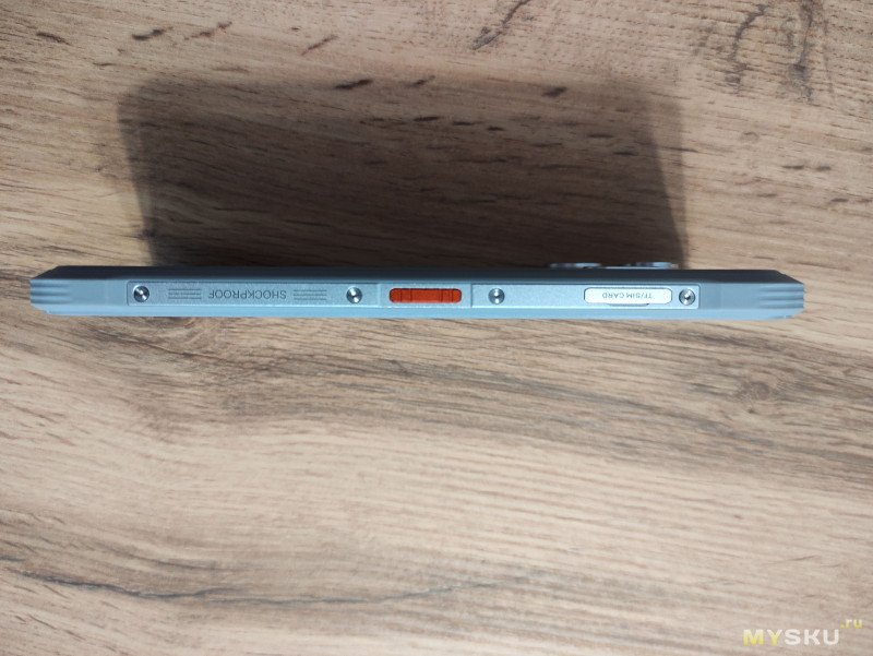На левом борту располагаются слот для сим и SD карты, кнопка доп функционала, и надпись Shockproof.