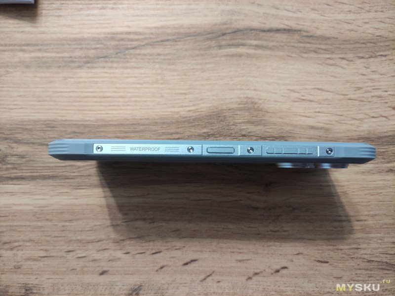 Справа кнопка включения-пробуждения со встроенным отпечатком пальцев, а так же качелька громкости, ну и конечно же надпись Waterproof