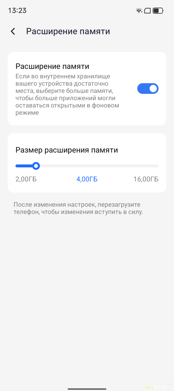Встроенная память 256 Гб, ОЗУ 8 гб, с возможностью расширения до 24 гб за счет использования файла подкачки. Делается это ползунком в настройках телефона: