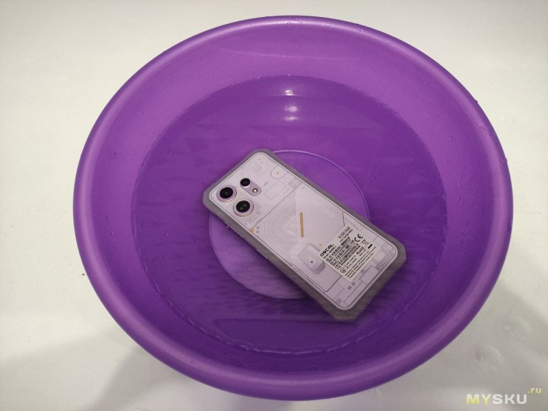 По заявлениям производителя смартфон имеет защиту ip68. Я всегда с настороженностью отношусь к подобным заявкам. Однако всегда интересно испытать девайсы под водичкой, этот аппарат мы тоже маленечко помучаем. Первым делом по классике, опускаем в тазик с водой. В моем случае телефон полежал пол часика, ну и соответственно ничего с ним не произошло.