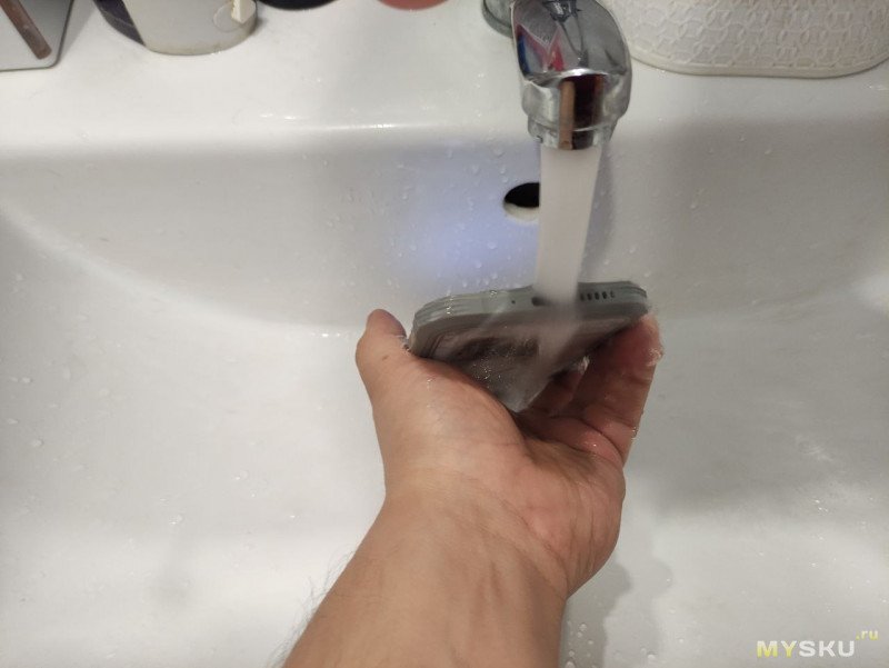 Далее перешел к чуть более жесткому испытанию на водонепроницаемость. Струя воды прямиком во все щели смартфона. Был на моей памяти смартфон с заявленный ip68, но прямой струи в порт зарядки не выдержал:))) А тут кандидат как будто рыба в воде)