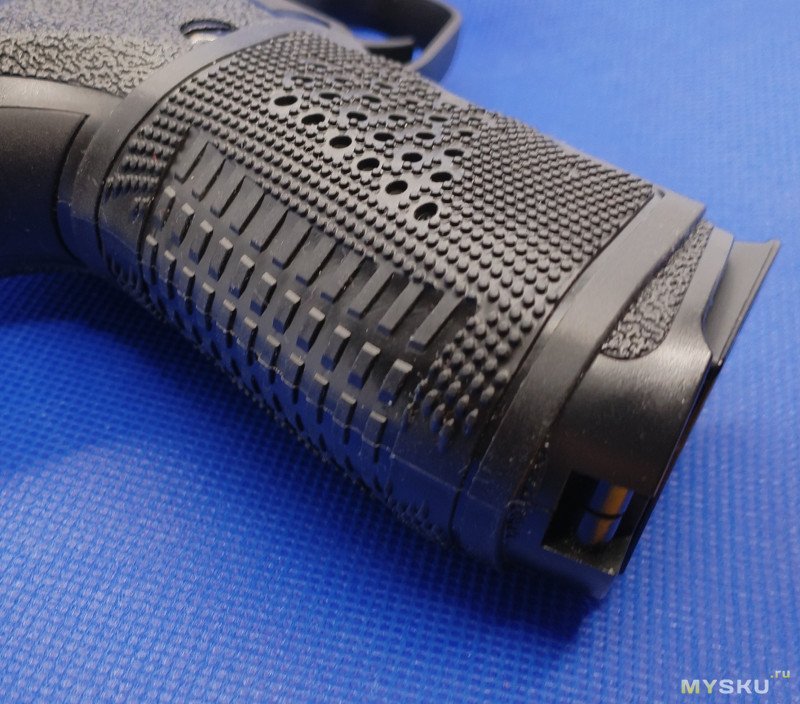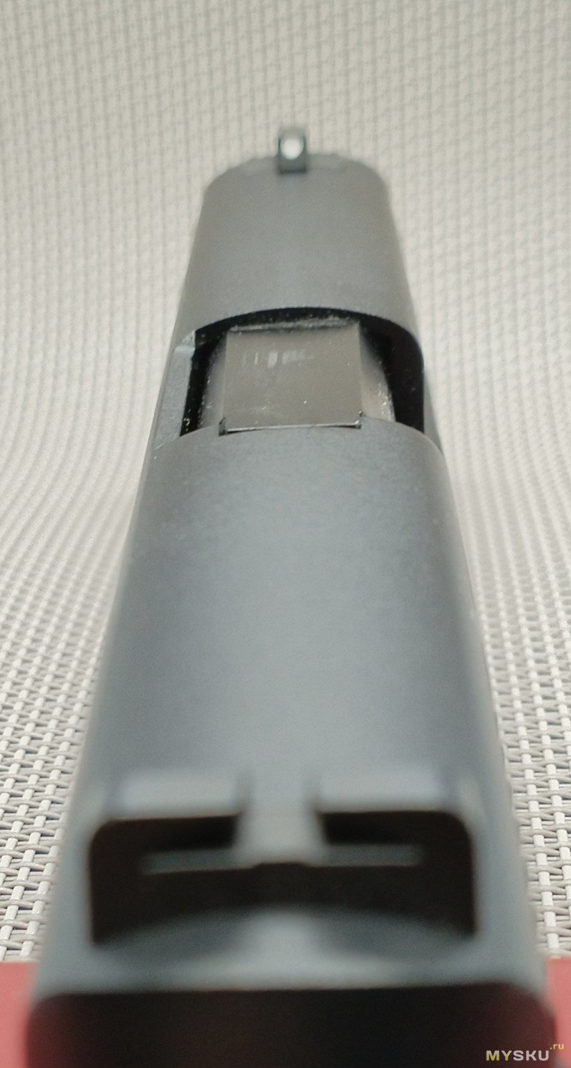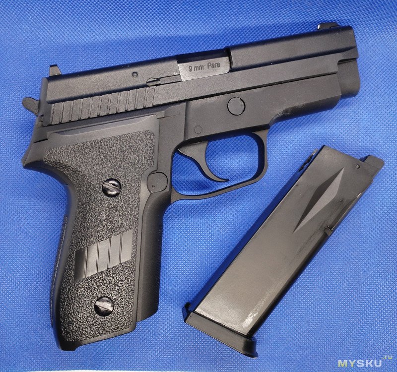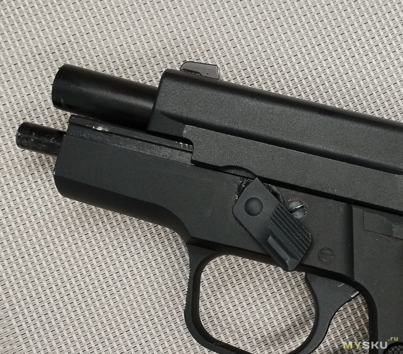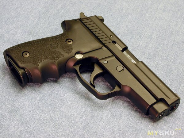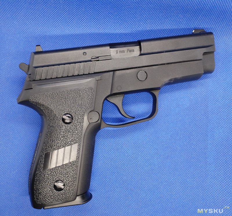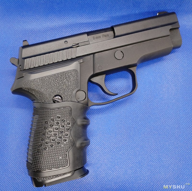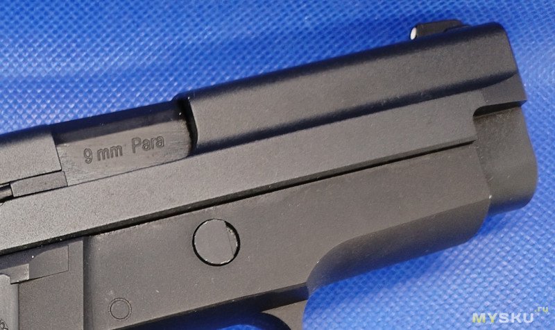 Кроме надписи на казеннике ствола «9mm Para» больше никаких маркировок нет. Даже на щечках рукоятки надписи «Р229» тоже нет. Пластиковые накладки не цепкие, скользкая пластмасса немного напрягала и я одел рукоятку в резиновый рукавчик. Хват стал лучше