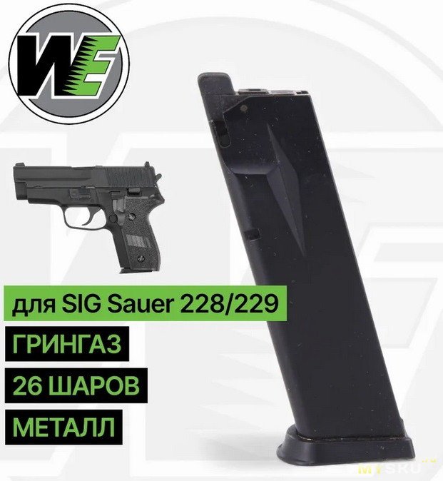 Производитель: WE Airsoft (Тайвань). Калибр: 6,0 мм (.236). Боевой прототип: Sig Sauer P229 (Германия). По принципу действия: Green Gas. Дульная энергия: 1,7 Дж. Емкость магазина: 21+1. Боеприпасы: пластиковые шары 6 мм. Blowback: да. Скорость выстрела: 90-100 м/с. Hop-up: регулируемый. Материал: алюминиевый сплав, пластик. Цвет: черный (Black / BK). Режим стрельбы: полуавтоматический. Планка Weaver / Picatinny: нет. Длина: 195 мм. Вес: 865 г (1085 г — в упаковке).