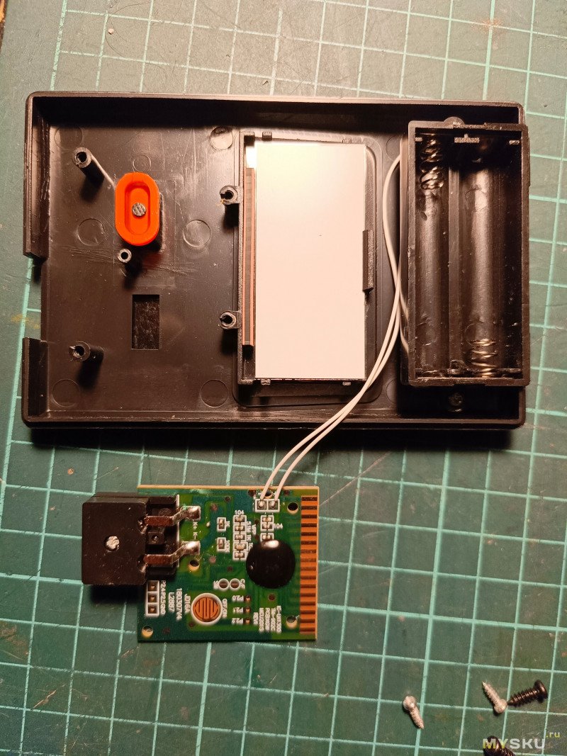 Но если есть желание увеличить срок службы батарейки, то можно сверху прикрепить маленькую солнечную панель (у меня была от сломанного калькулятора) и провода прикрепить параллельно батарейке — при свете батарейка будет немного подзаряжаться.