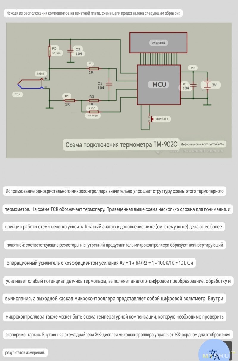 К нему нашел статью на китайском, со срисованной принципиальной схемой, её анализом и калибровкой показаний подстройкой резистора 100K: bbs.instrument.com.cn/topic/8240768