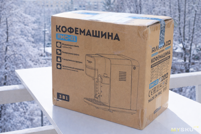 С торца коробки — перечисление фич кофемашины, а сзади красивая контурная иллюстрация самой машины. Дизайн-с!Комплектация: