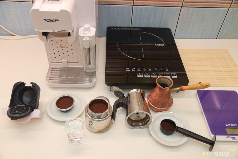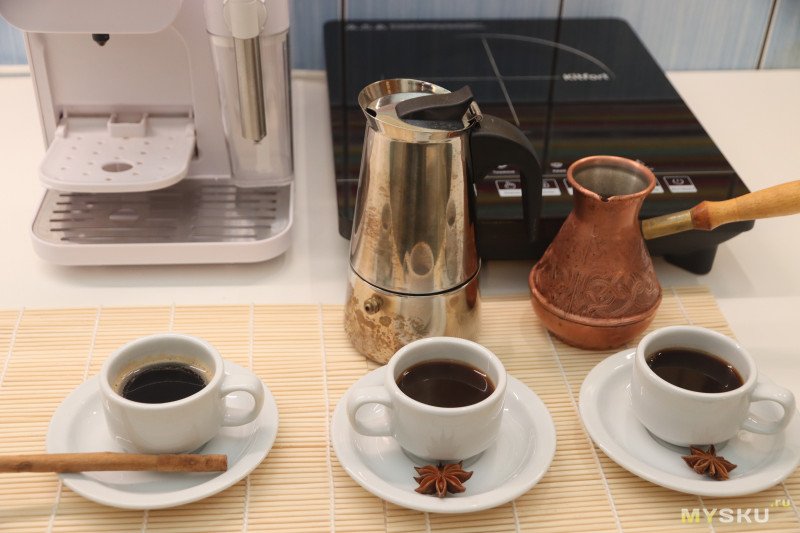 А практика? Таблицы, графики – это все, конечно, прекрасно, но большинству хочется просто утром выпить чашечку кофе. Быстро, просто и вкусно. Понимаю. Я приготовил три распространенных механизма для приготовления кофе. Турка, гейзерная кофеварка и наша кофемашина. Они заправлены одинаковым количеством молотого кофе – по 5 грамм. У них почти одинаковое количество воды. Почти – потому что гейзерная кофеварка не может собирать воду с самого донышка. Так что я ей долил грамм 20 дополнительно.