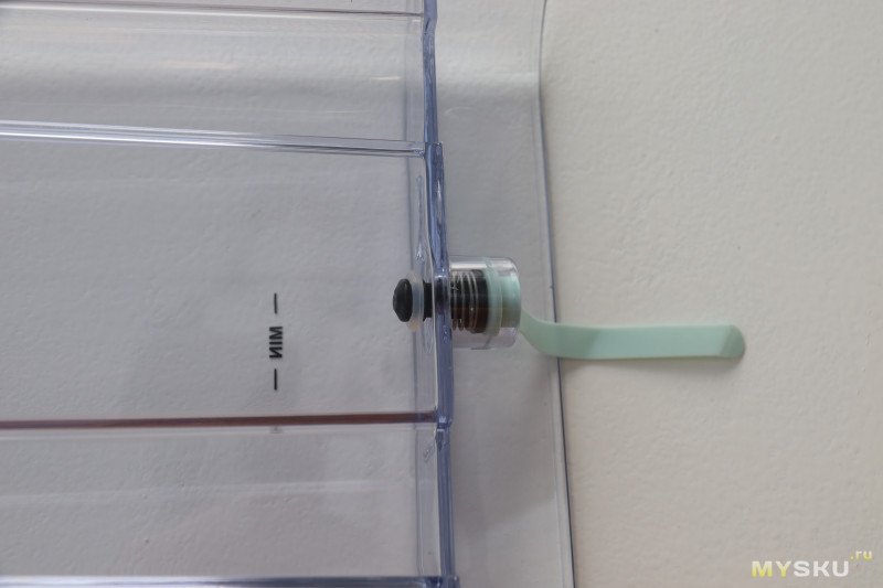 Закрываем крышку. Иголка, встроенная в крышку, прокалывает верх капсулы. Через нее капсула начнет наполняться водой, и при достижении определенного давления откроется клапан на дне капсулы и потечет кофе. Наполняем водой резервуар. Перед первым применением не забываем снять силиконовую пробочку со сливного клапана.