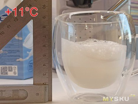 Начнем с температуры. Я вспенивал молоко три раза: при комнатной температуре, при температуре +11°C (из холодильника) и подогретое в микроволновке до +70°C.