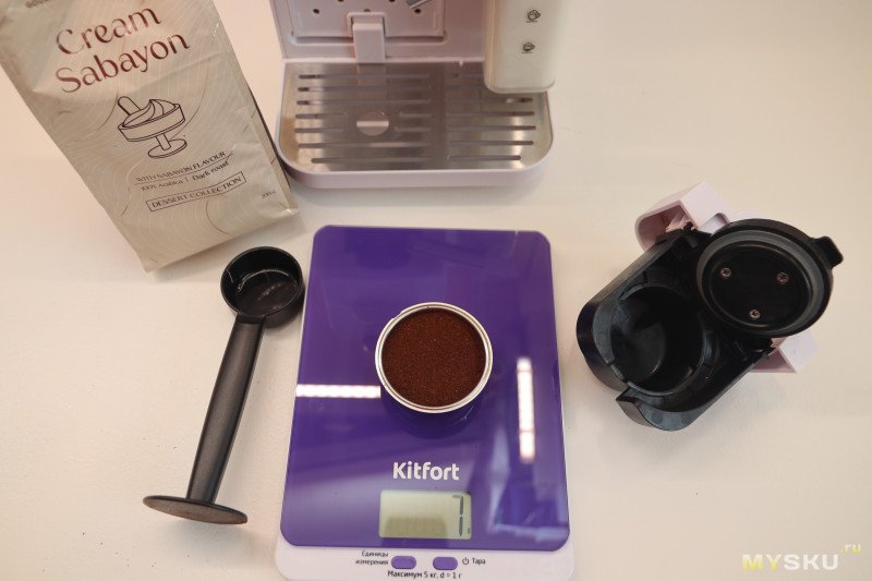 Для тестирования я купил молотый кофе Jardin Cream Sabayon. Помол оказался что надо. Кофе дает приятнейший аромат и густую пенку при заваривании. На упаковке упомянут ароматизатор. Наверное и пенообразователя тоже добавили. Но если об этом не вспоминать – то, пожалуй, самый вкусный и ароматный из всех, что я готовил в этой машине. Правда, расходуется быстро. 7 грамм такого неплотного продукта выглядит как столовая ложка с горкой.