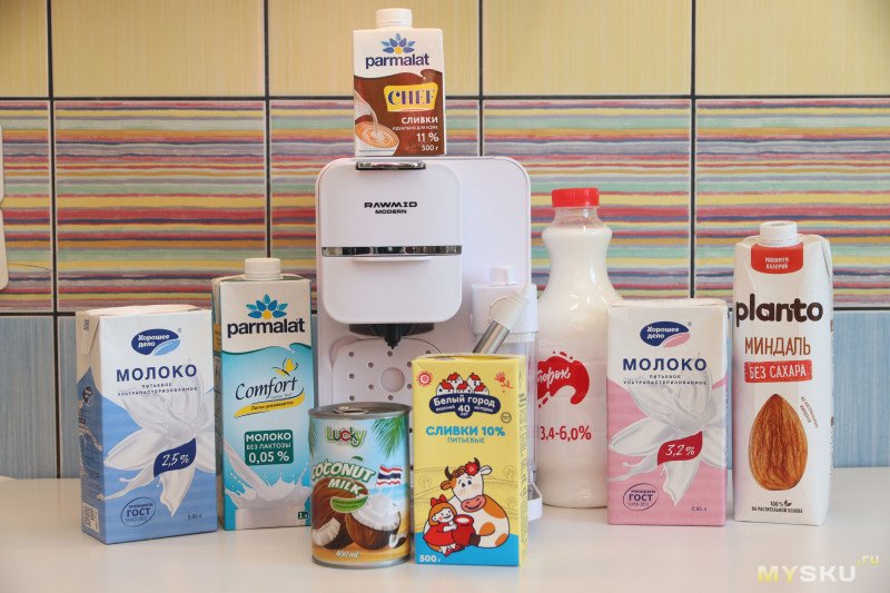 Исследуем молоко разных производителей, разной жирности, а также специфические виды, а именно безлактозное и растительные — из миндаля и кокосовое. Посмотрим, как они поведут себя в капучинаторе. Все тесты делались в крайнем правом положении рукоятки капучинатора, в котором пена наиболее пышная.