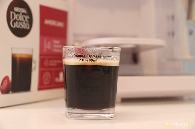 Для американо машина отмеряет вдвое больше воды. И если классический рецепт требует добавить в стандартный эспрессо обычную воду, то машина свежую воду конечно же не добавляет, а добросовестно прокачивает ее через капсулу. Так что американо получается крепче, чем по каноническому рецепту. Тем более, в таком режиме успевает лучше прогреться капсула и адаптер, так что кофе получается достойным.