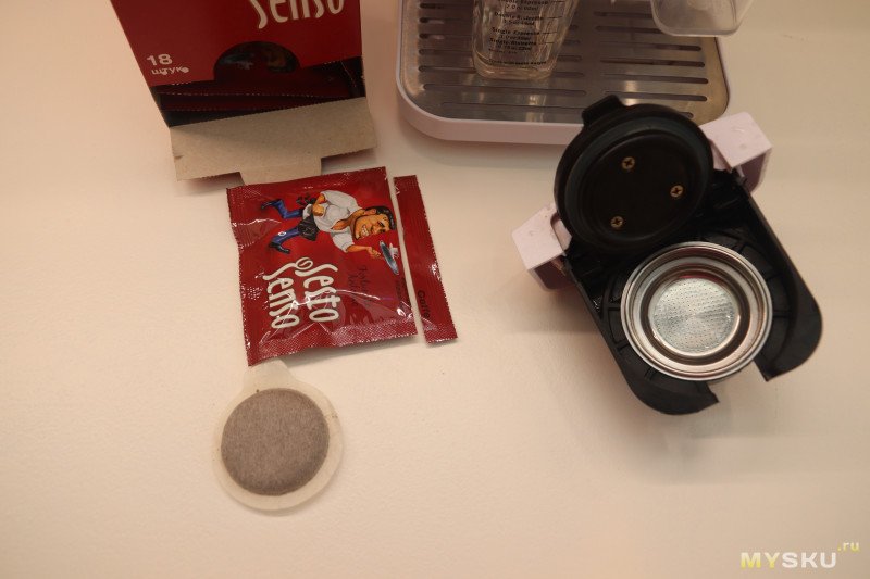 Пакетик вкладывается в ситечко, крышка закрывается, адаптер вставляется в машину и можно запускать.