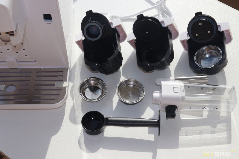 Контейнер для молока. Ложка для кофе, она же темпер для утрамбовывания кофейного порошка в ситечке. Инструкция. Адаптеры для разных форм кофе: