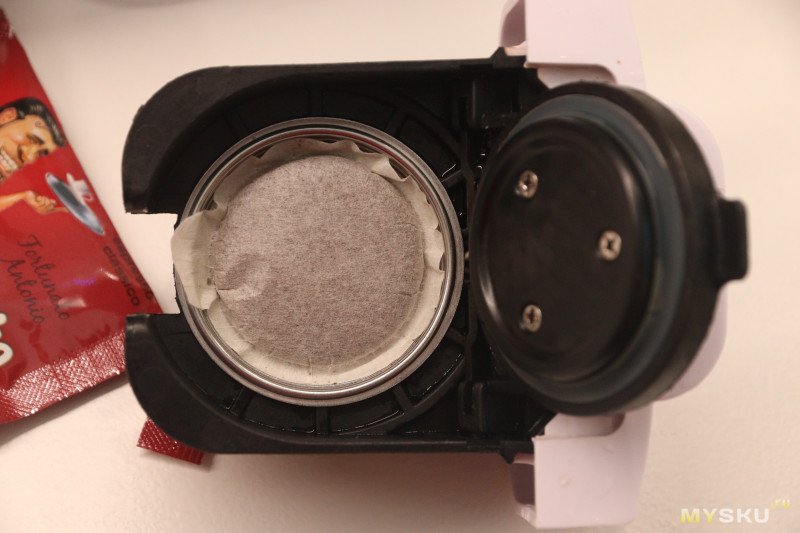 С молотым кофе хлопот побольше, чем с капсулами. При покупке кофе нужно обратить внимание на помол. Если он слишком мелкий – отверстия ситечка быстро забьются. В этом случае ситечко надо разобрать и промыть. Разбирается ситечко просто. Поддеть ножом пластиковую насадку, она легко отойдет. Под ней силиконовое колечко, плюс небольшая сеточка из нержавейки. Промыть, продуть, и все снова будет хорошо.