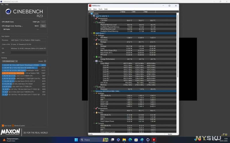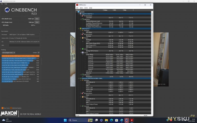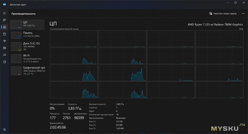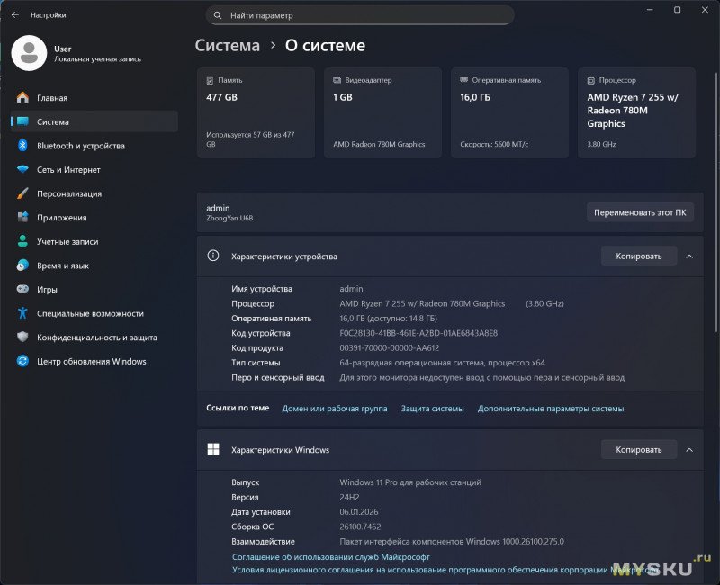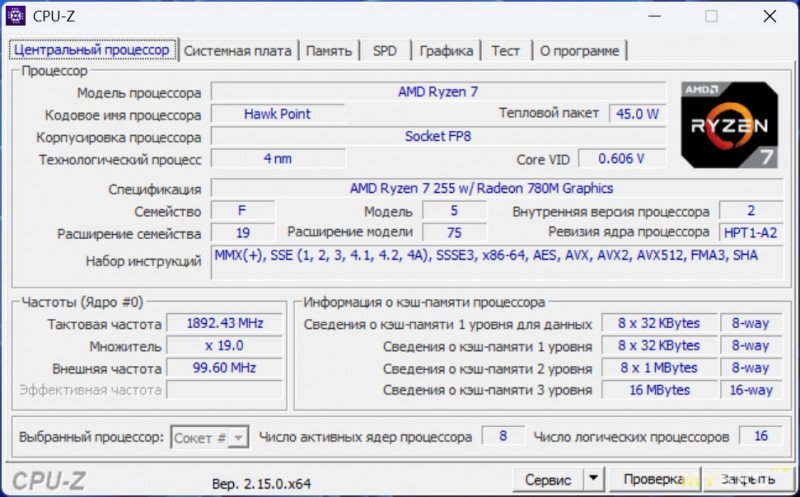 Ноутбук базируется на относительно свежем процессоре — AMD Ryzen 7 H255 на архитектуре 4-нм Zen 4, который вышел год назад. Для вычислительных операций задействуется 8 ядер и 16 потоков. «Камень» работает на базовой частоте 3.8 ГГц с бустом до 4.9 ГГц. Оснащается встроенной графикой Radeon 780M. Размер теплопакета обычно закладывается производителями ноутбуков, но находится в пределах 35-54Вт. Процессор поддерживает память DDR5-5600, LPDDR5X-7500, инструкцию AVX512, кодирование/декодирование AV1, несколько видеовыходов и PCIe 4.0.
