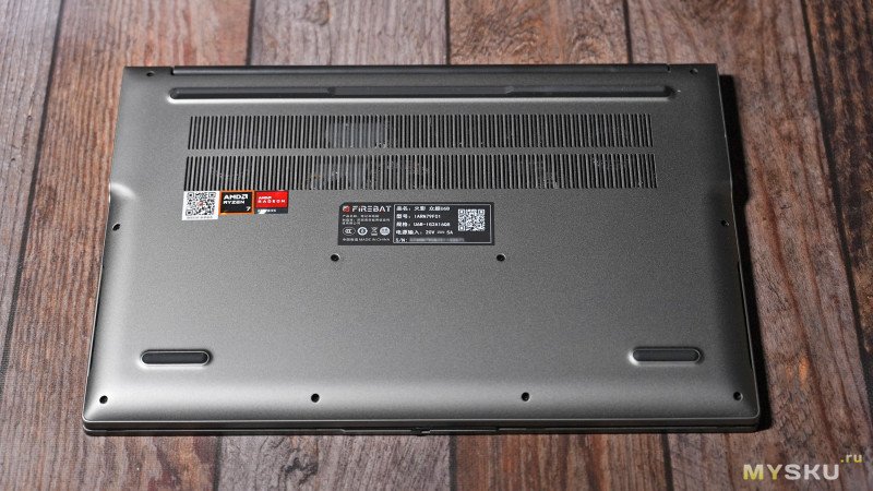 Нижняя сторона металлическая. Здесь три резиновые ножки, вентиляционные отверстия и даже цветная наклейки от AMD, что редкость в китайских ноутбуках. Прорезей стереодинамиков здесь нет, так как они вынесены в другое место — по бокам корпуса.