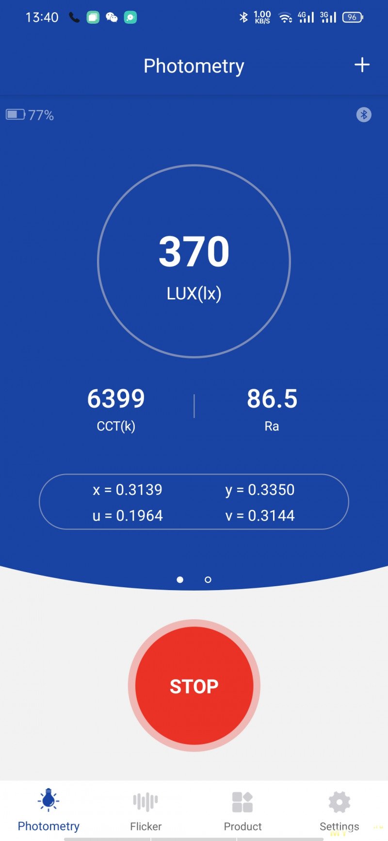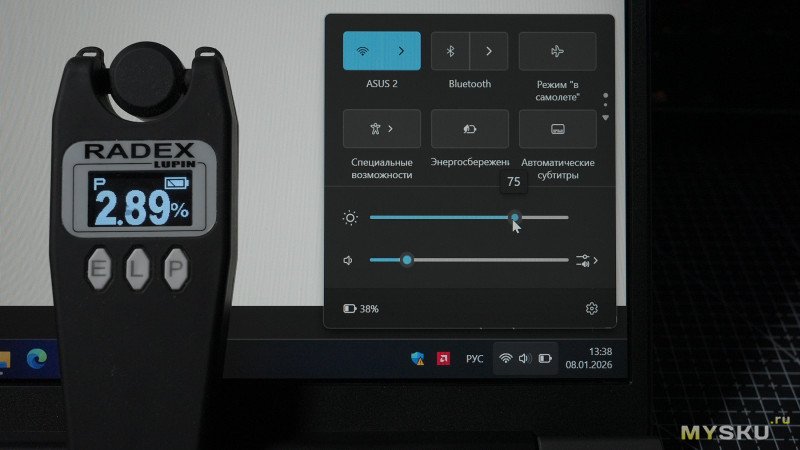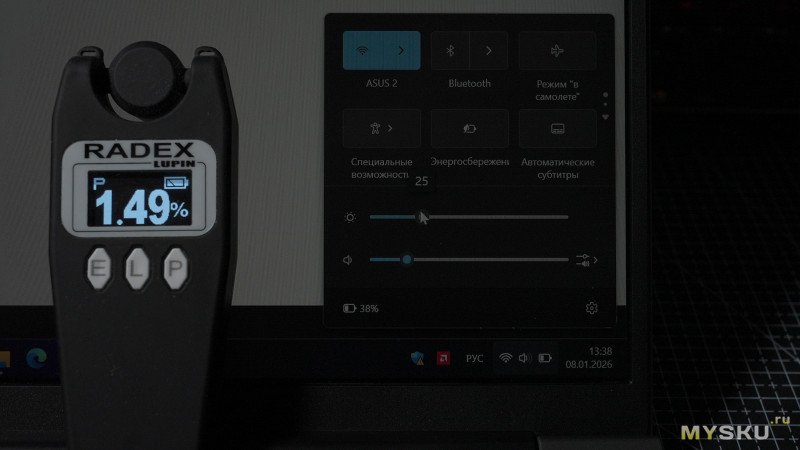 Измерения проводились при вплотную приложенным к монитору датчиком. Уровень яркости подсветки 100%. Все настройки и калибровки стоковые, ничего не корректировалось. Измерено 370лкс.