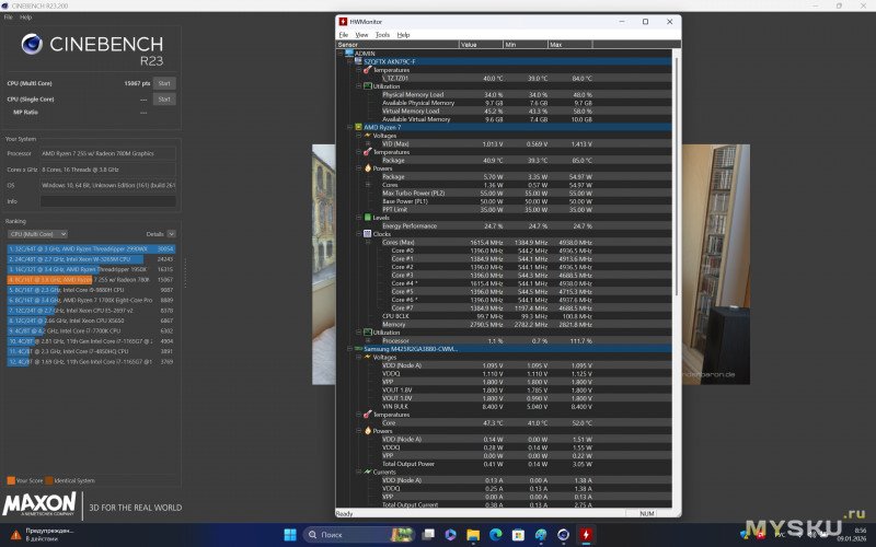Для оценки производительности запустим тест Cinebench R23. На старте и во время прохождения многопоточного теста частоты на всех ядрах держатся в пределах 4 ГГц — 4.1 ГГц (TDP 45-50W), а температура нагрева CPU периодически достигает 85°C (кулеры процессора шумят довольно сильно), но сильнее нагреваться не даёт. При повседневном офисно-браузерном использовании температуры не поднимаются выше 55°С, система охлаждения работает тихо. Результат по многопотоку получился 15000 баллов и 1680 баллов в однопотоке.