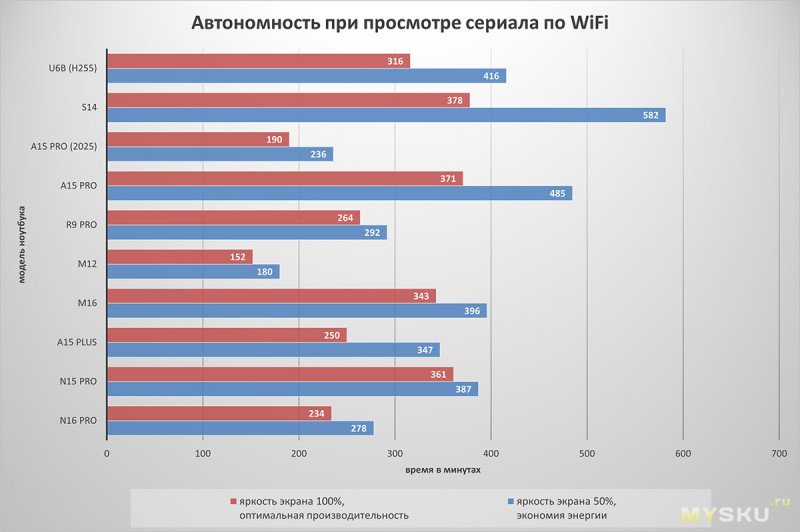 Время работы проверяю по максимально житейскому сценарию — путём запуска плейлиста с FullHD сериалом на ютубе в Chrome. Время работы в энергосберегающем режиме с 50% яркости подсветки дисплея дошло почти до 8ч, это выше среднего. При 100% яркости и «оптимальной производительности» время автономности сократилось приблизительно на 2.5 часа.