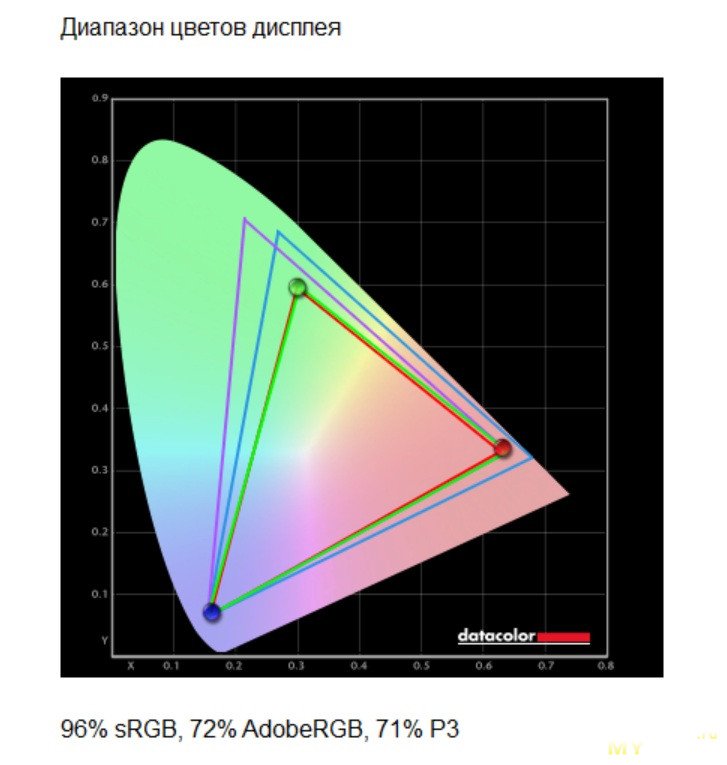 Колориметр намерил 96% в sRGB-пространстве, немного не 100%, но всё равно неплохо.
