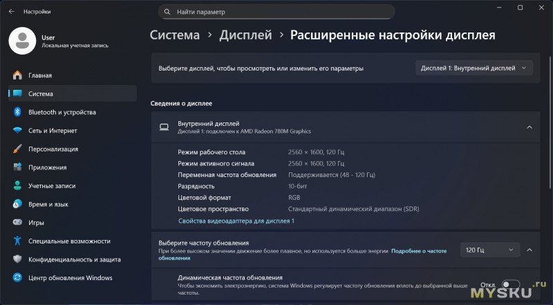 Для вывода изображения здесь используется дисплей с разрешением 2560х1600 при соотношении 16:10. Доступная частота обновления 120Гц.
