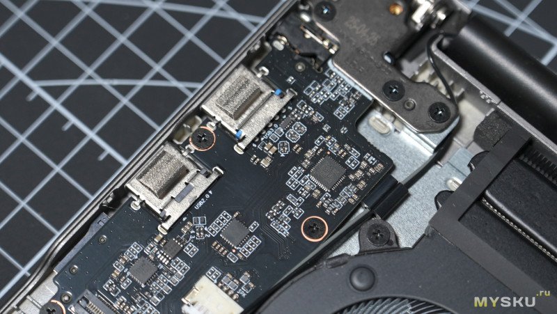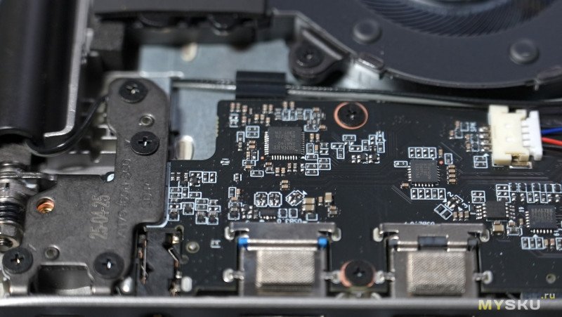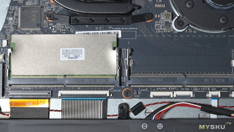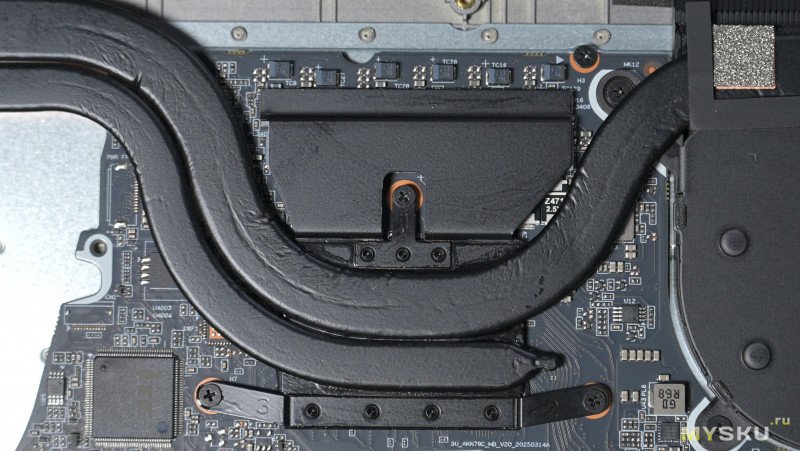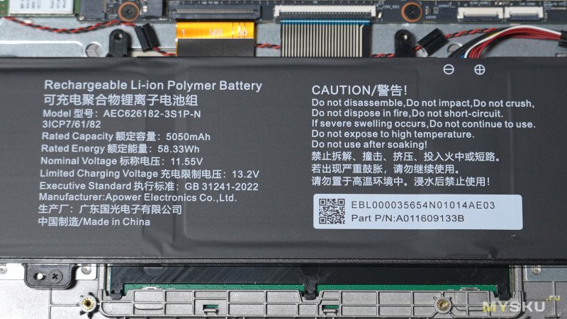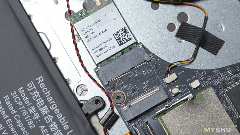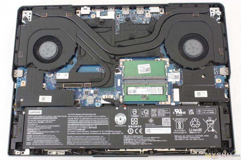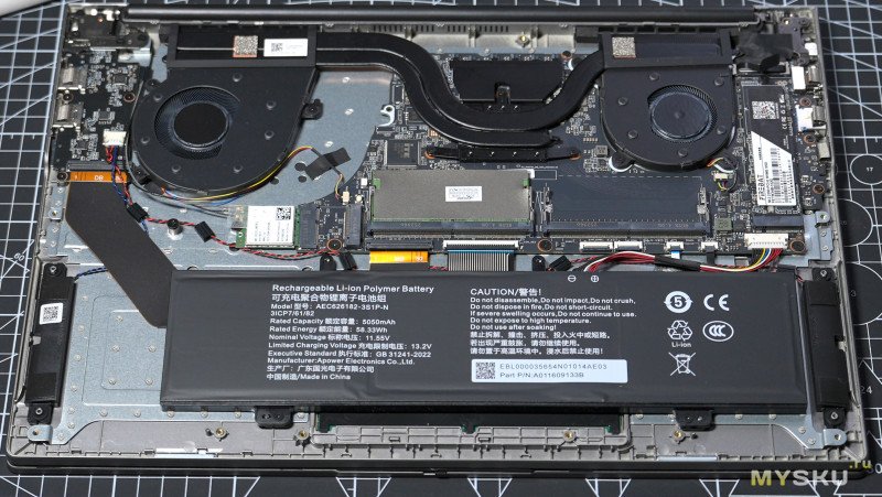 Нижняя крышка держится на винтах и защёлках. Компоновка внутри типичная для большинства ноутбуков — вся основная электроника с системой охлаждения занимает верхнюю половину пространства, а нижняя половина отведена под литий-полимерный аккумулятор с энергией 58.33 Вт∙Ч и пару стереодинамиков. Под оперативку доступно два слота, один из них пока пустует, в перспективе можно расширить до 64Гб. Под SSD NvMe память тоже имеется два слота. Сетевая карта съёмная RTL8852. За отвод тепла отвечает два вентилятора, обслуживающие по одной теплотрубке.