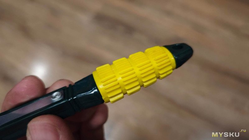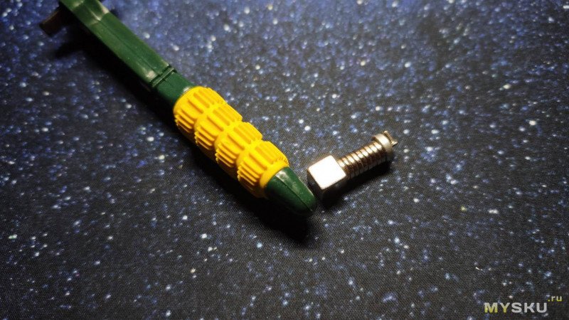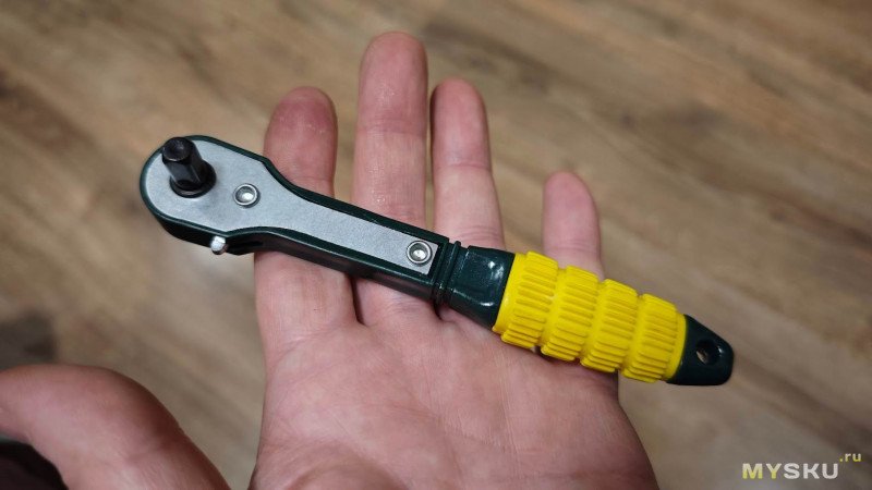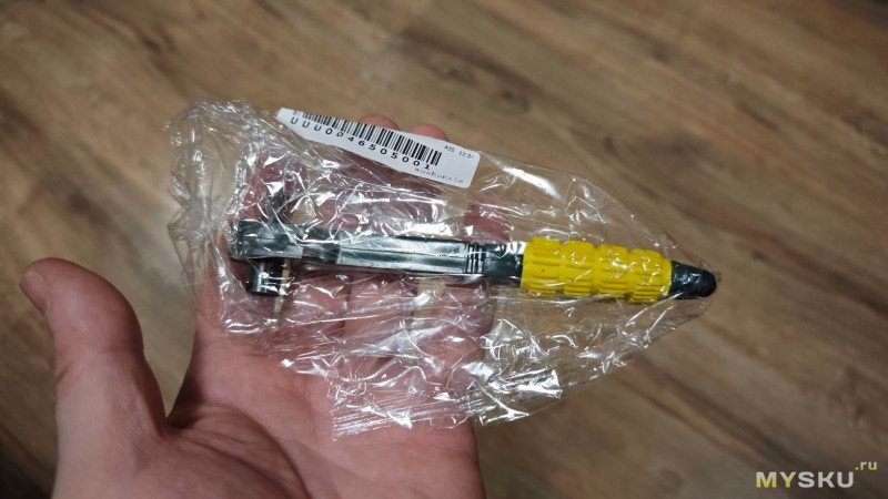 Рукоятка у ключа соответственно общим габаритам инструмента, тоже маленькая, обёрнутая ярким жёлтым рельефным силиконом.